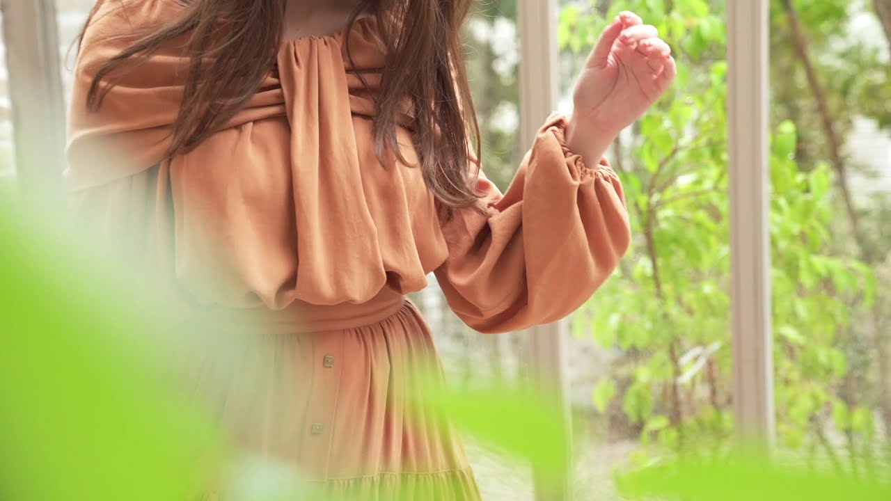 たっぷりギャザーが入ったフレアシルエットは歩くたびに優雅に揺れ、フロントのスクエアのボタンがデザインポイント。