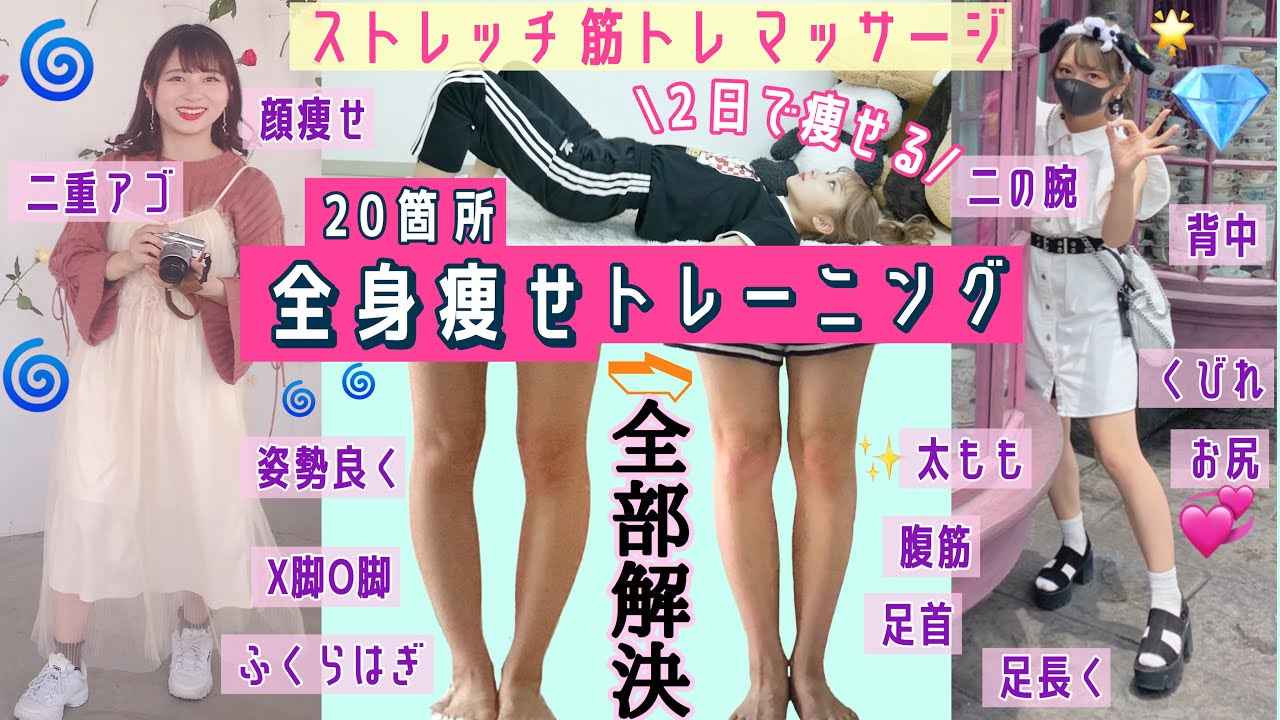 足首とふくらはぎと太もも(内ももと外もも)を細くX脚とO脚なおしてお尻小さく高くして足を長くして、腹筋割って、背筋鍛えて、姿勢良くなって、肩まわり綺麗にして、二の腕細くして、二重あご無くして、フェイスラインを綺麗にして、体柔らかくするマッサージと筋トレとストレッチ紹介するよ〜!!!!