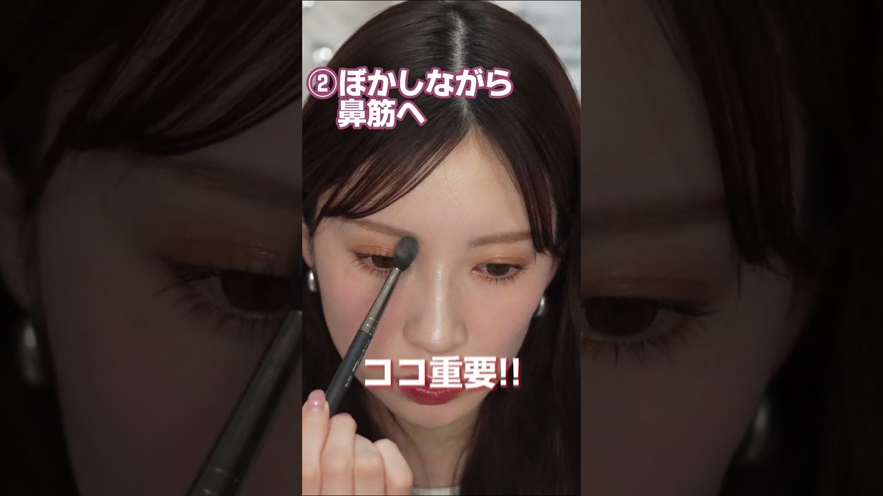 最近やってるノーズシャドウのやり方紹介 しますま使っていくのは何でもいいので シェーディングで何が大事かって言うと このブラシなんですねこういう形のブラシ を用意してください絶対にこう薄い色を 使うんですよまずこの眉毛の下のここね ここはノーズシャドウしたくない人も入れ た方が圧倒的に掘りが深く見えるんですよ ねこのままここに溜めてその残りでこう 真っすぐ組んねんけどこん時にここ内側に 入れすぎるとここが細くなってすごい酔っ た顔で顔がなんかちょっとやましいわって いう感じにあんねんけど割と外側からこう 下ろしてくるので鼻先はちょっと濃い色で ここに影入れてあげることによってここに 高さが出るんですよ鼻って1番ここ高く 見せたいじゃないですかだからここにも 塗るんですよね今左右比べると掘の深さは 変わりますよねここをしっかり入れてあげ て内に入れすぎない絶対こっちの顔の方が 可愛いやこっちなんかちょっと鋭すぎるや んていうのでこのねノーズシャドウの違い 皆さん場所しっかり覚えてやってみて ください