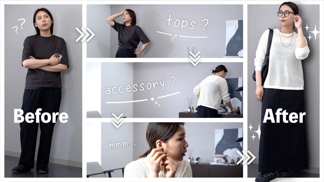 どうもコスパッションゆりです本日は実際 コーディネートってどういう風に考えてる のっていうところをお見せしようと思い ますこのチャンネルでおし料をセンスだけ ではなく理論で徹底的に解説てきていて おしゃりに関する動画はこれまで750本 以上上げてきましたまた私自身がモデル 体系ではないからこそスタイアップのコは より自分を魅力的に見せる方法についても お話していきます非最後まで見ていって くださいというわけではです結構動画の中 でもコーディネート紹介とかはねしたりと かすると思うんですがじゃそのコーデって どういう風に考えて組み立ててるんだっけ みたいな家庭についてはあんまりお見せ する機会がないんですよなので今回はです ね3日分のま設定というか シチュエーション別に私だったらこういう ところを気にしてこういう思考錯誤をして コーディネート組んでいくかなみたいな ところの過程をまるとお見せしていこうと 思いますそれぞれ晴れだったり雨だったり いっぱい歩く歩かないとかそういうところ もコミコミでご紹介していこうと思うので 是非よければ最後まで見てってください それでは早速行きましょうそれではですね ちょっとこのリラックスしてる感じの格好 から始めんですけども1日目最高気温 29°最低気温19°天気は晴れいっぱい 歩く日なのでまスニーカーは履きたい ところかなという感じのコーディネート ですねお友達とちょっとショッピング回っ たりとかまどんな予定になるかどっちかて いうと読めないいっぱい歩くのかもしれ ないしいいお店があったら入るのかもしれ ないしみたいな感じでちょっとわかんない から足痛めないようにだけしときたいなっ ていう日ですそんな時のコーディネートを 組んでいこうと思いますなのでまずはです ね一旦スニーカーでしょと思っているので スニーカーだなっていうのと最高29°で 晴れってことは結構熱いなんならノー スリーブになりたいぐらいの暑さの可能性 があるのでま薄手というか半それだったり ノースリーブだったりそれぐらいの夏仕様 で行っていいなっていう感覚ですよねでお 友達とショッピングなのでそんなにバカ デカバッグとかじゃなくてもいいなと思い つつちょっとしたメイクポーチとかミニ 財布とそういうのは入るようなバッグで いこうかなと思ってますでは早速コーデを 組んでいきますねまずは一旦めっちゃ歩 くっていうことだったのでこういう ちょっと歩きやすいようなハイテクの スニーカーを選んできましたまただこう いうパンツにスニーカーまで行くと めちゃくちゃメズライクだなっていう感じ がしてちょっとお友達となんかルンルン みたいな感じでいくんだったら私はボトム はスカートの方が涼しいし歩きやすいかと いう気もするので1回スカート入ってき ますねでスカートになるとま結構なんか下 半身のバランスは整ったなっていう感じ なんとなくレディーな印象のものと結構 せめたメンズっぽいようなゴツとした スニーカーを合わせて破半身はオッケー上 半身がね今またちょっとなんかリラックス してんなっていう感じがするので一旦 トップスをもうちょい遊び聞かせたものに しますねやっぱスニーカーも履いてるし ちょっとリラクシーな感じなんで上が カジュアルすぎるとちょっとカジュアル すぎかなって感じがするからもうちょっと 凝った感じっていうのを出していこうと 思います例えばなんだけどこんな感じで もうメッシュ重ねちゃうみたいなねあの さっき半袖とかもいいなって思ったけど 一層のこともほぼキャミみたいな状態で この辺布合ってないようなもんなんでね スースーと風通しもいいしっていう感じで こういうスタイルも全然ありですねなんか モノトーンでまとまってるからこっから何 してもオッケーみたいな感じがいいなと 思いますただちょっとこのね髪型だと私的 にはなんか優しいというかちょっと遊びが 足りないなみたいな感じが思うんで結んで いきます最近髪の毛切ったんですよ結構 ショートになったでもなんかちょっとボ ブっぽい感じになってるからうまくやら ないと家庭的な印象みたいなものが出 やすいんでそこだけちょっとね コーディネートで辛さを足す時にはこう やってコンパクトに縛ったりするのもいい かもしんないねこんな感じでちょっと下の 方とかでギュっとただただまとめてあげる これだけで結構すっきりすんじゃないかな と思いますでこうなるとアクセサリー 欲しいよねアクセサリーは まそんなにジャラジャラしてなくてもいい んじゃないかなと思うのでなんかシンプル な定番というかねいつもつけているような フープっぽいピアスをつけていきますで なんかリングもちょっとごつめなやつこう いうのをけるとやっぱモノトーンで シンプルすぎるからそれをちょっとカバー していこうかなと思いますこんな感じでね ちょっとキラっていう感じが加わったから ネックレスもしちゃっていいかもボール 