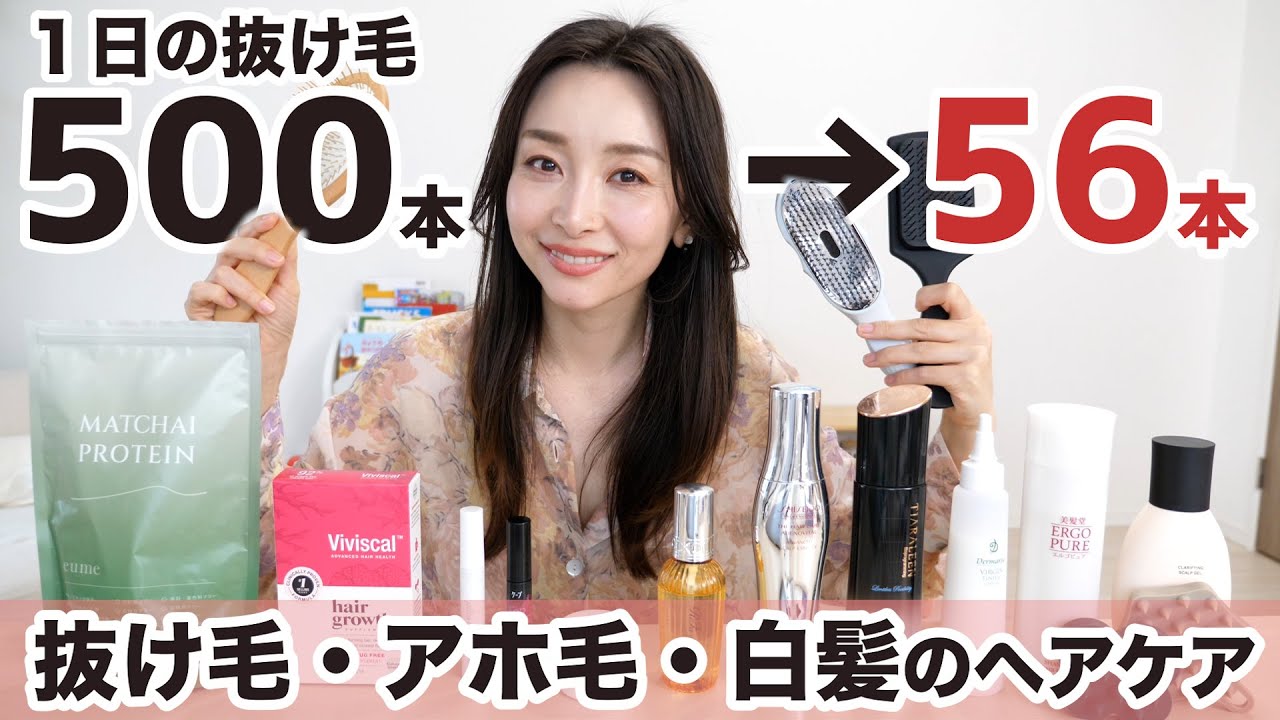 皆さんこんにちは朝日です今日はですね1 日の抜け毛500分から56本まで減らし た私のヘアケア方法をご紹介していこうと 思います ま思い起こせば今年の2月頃ですねあの 元々髪はよく抜けるなと思ってたんですよ でもま猛量も多いからま抜けてちょうど いいぐらいだなみたいな感じで甘い考えで いたんですけども解いたりとかするじゃ ないですか手串でこうした時にもうわって この辺に毛がまとわりついててあれ私 ストレスかなとか連携になっちゃったか なっていうぐらい抜けるようになって しまって1日でも床にこの私の毛が いっぱい落ちてるっていうのが続いててで もなんか徐々にだったんでで元々抜けも 多かったからそんなに気にしてなかったん だけどなんか朝日の毛やばくないみたいな ことを言われてやっと気づいた風呂を入る 前のブラッシングで落ちた系そして洗った 後に集まった毛で最後えブローして落ちた 毛全部書き集めて数えたんですそしたら なんと500本も抜けてたっていうことが 判明してチャatトGPT曰1日の抜け毛 の本数は平均して50本から100本程度 が正常なんですってでそれが1日200本 以上明らかに多い抜けになったらま 何かしらの原因が考えられるのでま クリニックとかに相談するのがおすすめで すって出てくるんですけどももうそれの倍 以上ですよねは500本今までね束ねてい たゴムがもうスるスルって気がついたら 抜け落ちるっていうことも増えてきてもう これやばいっていうことで色々と本気で 見直したわけですでそもそも私小さい時 から髪の毛が多かったんで薄毛とかに一切 悩んでこずなんならめちゃめちゃ褒め られる方だったんです髪の毛でも実は私は ちゃんと直視できていなかったけどももう 10年ぐらい前からこう不自然なサイクル で抜けてしまうアホ毛の量が尋常じゃ なかったり2年前に子供を産んでから異常 にこの盗長部からの白髪が一気に増え出し たりこの髪色も私的にはポジティブに捉え ていたけども単純に昔よりも明らかに1本 1本の毛が細くなっていることによって毛 が透けてるからなんか茶色っぽく見えてる 知らぬ間にどんどんどんどん毛が細く 弱くろくなってってるっていう状態になっ てたんですよね今色々と試している現在 進行系ではあるのでま今後アップデート するとは思うんですけれども現状あの使っ ているものなどをご紹介していきたいなと 思ってます抜け毛薄毛え白髪がアホ毛など などですねお悩みの方の参考になったら 嬉しいなと思っております はいということでま一挙にお見せし ましょうかねこんなことやってますって いう感じでいきますよ私が使ってる アイテムせーのはいということで一気に 並べてみましたけどもこんな感じの内容を ねえ今日はご紹介していきたいなと思って おりますまずはインナーケアからご紹介し ていこうと思うんですけどもあのチャAT GPTもタンパク質鉄亜鉛などの栄養不足 も原因っていう風にねあの書かれている 通りやっぱ髪の毛なのでタンパ質っていう のをめちゃめちゃ意識して取るようになり ましたまタンパク質って髪だけじゃなくっ てあの免疫も上がったりとか色々とねいい ことをづめなので是非ね皆さんにも撮って もらいたい栄養素でもあるかなと思うん ですけども私がもうすごく好きで何回も リピートして飲んでるので言うとゆミーの こちらが放じ茶プロテインとえまっ茶プロ テインっていうえものになります リニューアルして若干パッケージが変わっ たんですけどもこのまっ茶の方は抹っ茶と 茶いですねなのでちょっとこうスパイス感 もあってとっても美味しいうんでホイ プロテインとプロテインが入っていて1食 あたりタンパク質がえ8.7gですで こっちのまっ茶の方もすっごい美味しい これねこちらはホエイプロテインあとは イリンサラシアやコラーゲンなどが入って おりますこっちの方が若干えタンパク質が 多く11.26g ですね1色あたりこの2つのねすごく好き なところで言うとお湯がとってもいいん ですよねま物によってちょっとあの固まっ たりとかするプロテインとかあると思うん だけど私は冷え冷ヒ冷えで飲むっていう より理感はもう本当にお茶感覚で あったかくして飲むことが多いのですごく 粉ど時けがいいところが気に入ってます そして鉄とか亜鉛などをですね補給する 役割としてこちらのサプリアイブで購入し てるんですけどもビビスカルの紙成長 サプリメントというものになりますまよく 髪の毛にって言われる美容とかはあの アホ毛に悩んでた時ぐらいからサプリで 取るようにはしてたんですけどもこれは そんな美容が入っていたりカルシウム鉄 亜鉛なども入っていてかつアミノマーって いう独自成分が入っているらしいんですで これが海洋性のタンパ質を元に作られて いるようでなんかね調べるとグリーン ラウンドで暮らす犬の女性には薄着の人が 少ないと言われています でその要因は彼女たちが食にしているアザらしや青魚などに多く含まれる海洋性タン