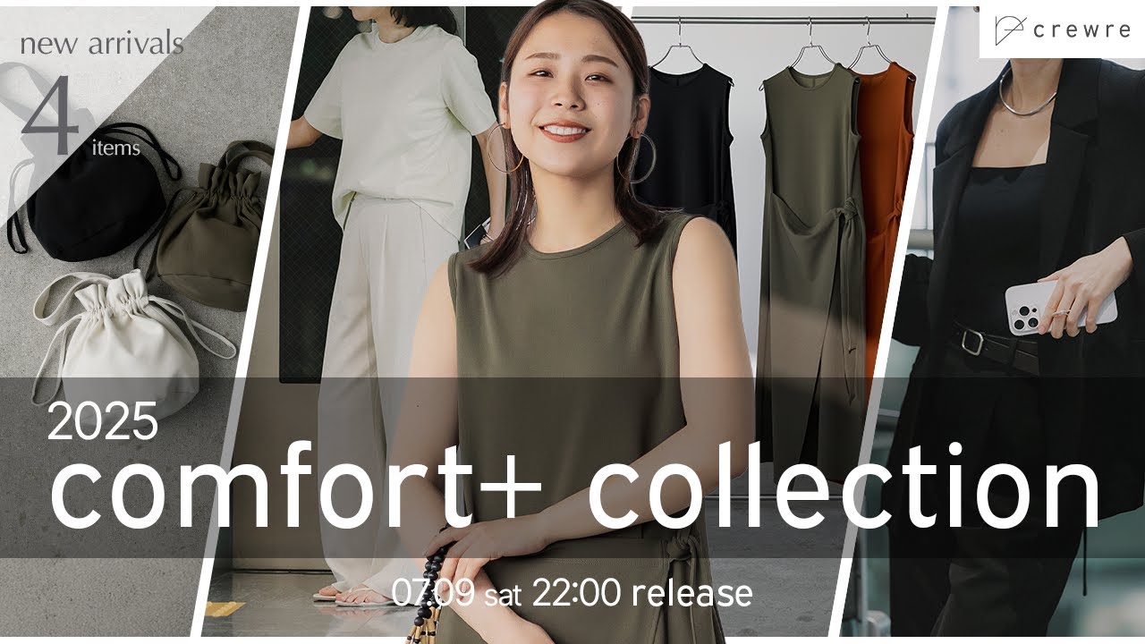 [音楽] どうもコスパシです本日はクルーデ 2025コンフォートプラス コレクションのラインナップ発表ですはい というわけでですね今回まずこの コレクション名なんですけども コンフォートプラスコレクションという ものを皆さんにお届けしたいと思ってい ます昨年はこの時期はですねアクセサリー コレクションっていうものを出してみたり していたんですが今年はですね アクセサリーではなくこの梅の時期をより 楽しんで欲しいなとかこれからの時期に もっとこう寄り所として使っていきたく なるようなアイテムをですねギュギュっと 集めたのでそれを皆さんにご紹介していき ますこのコンフォートプラスというまず コレクションのコンセプトからお話しして いきますこのコレクション名が コンフォートコレクションではなくって あえてですねコンフォートプラス コレクションというので名前をつけました でじゃあこのプラスという部分には何が 込められているのかっていうとですね ただただこのコンフォート快適みたいな コレクションにするとどんどん無敵みたい な作業服が出来上がってくるんですね重要 にもなりませんシャカシャカですマジック テープベリーンみたいななんかその機能に 全ぶりしましたみたいなご洋服が 出来上がっていってしまうと思うんですが このプラスという部分に快適だけでは なくって解きめくようになるとか心が踊る とかその快適さを味方につけた上で楽しい よね可愛いよね嬉しいよね解きめくよねっ ていうそういった気持ちをギュギュっと このプラスというところに込めましたなの でこのコンフォートプラスコレクションで はですね快適さも心を踊る気持ちも何も 諦めない日常っていうのを届けられると いいなと思っておりますでこの コンフォートプラスコレクション自体の コンセプトとしてはトリートユアライトと いうものをせていただきましたここには ですねあなた自身を大切に扱ってねって いう意味だったりとか自分自身を正当に 正しく甘やかしてねっていうような意味を 込めています汗をかくから好きな色では なくってま白黒のものしか切れないかもと か出張で暑いけど長袖のジャケット着 なきゃいけないなでも汗でベタベタなんか ちょっとあんまり気分上がんないけどま しょうがないかみたいになんかこう しんどいけどしょうがないしもこれでな何 とかしていかなきゃっていう結構諦めが 連続していく季節だなっていうのを私自身 感じているのでそれをですね今回の クルーレベがお届けするコンフォート プラスコレクションのご洋服でそこを諦め ずに自分自身を燃やかしちゃおう心地よ くっていいじゃんっていうのがですね作っ ていけたらすごく嬉しいですそしてそんな お洋服を着ることによってなんとなく諦め ていた気持ちだったりとかまいいやって 思っていた気持ちから会いたいあの人に 会いに行こうかなとか行きたい場所に行っ てみようかなっていう前向きな気持ちの エネルギーがうわーって湧いてくることに つがったらいいなと思ってそんな気持ちも ひっくるめてですね伝わると嬉しいなと 思い今回のビジュアル作成だったりとか コンセプトムービーとかも作ってきました クルーレが届けたい2025 コンフォートプラスコレクションがこちら です うん [音楽] เฮ [音楽] ここからもう早速商品をご紹介していこう と思いますまずはですね今私が着用して いるドラコンフォトカラーTシャツです これ可愛くないですかなんかシンプルや んって思いました思いましたちっちっち ですよこれやっぱりもう冒頭でもお伝えし たように夏ってなってさじめじめするなと か今日も雨だしとかさなんか色々考えると さ結局グレー着たいなああ可愛いなああで もなんか実際過ごすってなったらちょっと 焦じみ気になるから厳しいわとかさ他のと か取り入れてなんか気分上げていきたいな だけどなんかしっくりくる色ないなみたい な風になんとなくまじゃあいつものあれで いっかってなりがちなシンプルなTシャツ こそもう何も諦めずに自分が嬉しいな解き なっていう色の洋服を着て欲しいしその時 にですね快適に過ごして欲しいなと思って 今回こちらを作りましたなので今回4色味 ご用意しているんですがその中にですね白 黒は作っておりませんでなんと言っても これ特徴なのはですねドライコンフォー トっていう風に言ってるんですけどもこの 着心地の良さとか生地の柔らかさいい感じ のお痴感そして張りつかなさっていうのは 残したまんま両面撥水加工汗じみの帽子 加工を施しました待ってたでしょうはい 待ってました私もこういうのうん買ってみ たりとかねこうカラ物のTシャツ着てみ たりとかするわけよで別にまいいや今日は もう思いっきりなんか外だしアクティブな 日だし汗か気にせずイエイみたいな日も もちろんあるんだけどさなんかちょっと そういう感じじゃないちょっとなんか今 湧き汗しみるの話違うみたいな時もある じゃ
