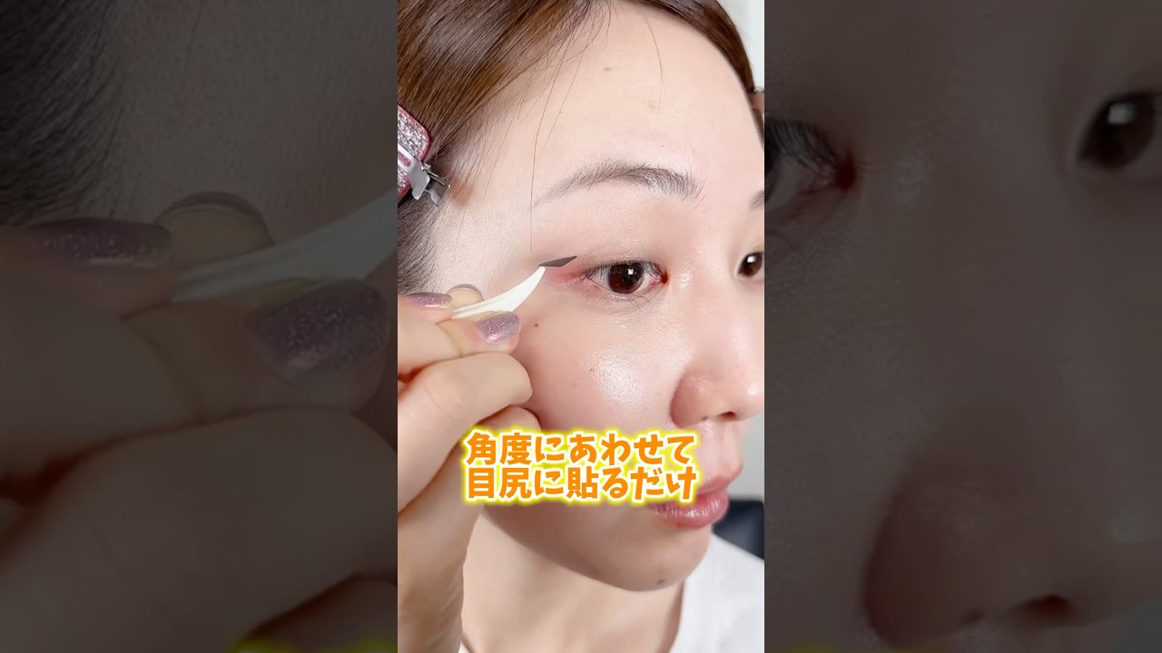 シールアイライナー貼るだけで絶対落ちな いってことですよね。AEXプレスで買い ました。ブランド名は読めません。狐の やつと犬のやつ買ってみた。他にも ブラウンとかあったけど、今回ブラック 買いました。中開けますとシール5枚 セットとあとね、ピンセットとプッシャー も付いてます。ちゃんとね、代に右左って 書いてあって分かりやすい。こっちが犬の デザインで、こっちが狐のデザイン。まず 犬のやつ貼ります。ピンセットが意外と 使いやすいっていう。 で、この角度に合わせて目尻に貼り付けるだけなんだけど、こんななんな感じ。これね、私もうね、 1 日すでに使ってるんですけど、結構いいです。こうラインで埋めちゃえばいいので、え、汗っかき夏いいと思います。心配なのはあれですね、絆創膏とかで被れやすい方、ま、もしかしたら痒くなったりするかもしれない。反対側に貼ります。角度はある程度たれ目にも釣り目にもできます。馴染む。水かけます。当たり前に落ちないですね。剥がしてみます。 こ、結構しっかり寝ちゃの企業さん、アイラインシールを作ってください。