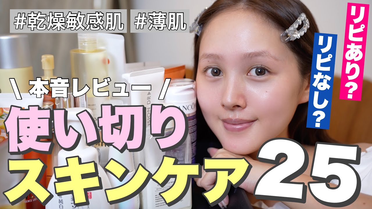 おおお。 こんばんは。しかのまです。今週も1週間 せーのお疲れ様でした。はい、すいません 。今日は収支スーピンなんですけれども、 今年初のジん使い切りスキンケア25 アイテム紹介していこうと思います。 スキンケア宣言からもう34年経過して いるんですけど、ほとんどが守りではある んですけど、結構ね、色々挑戦できては いると思うので実際に使ってみてリピアリ かリピなしかっていうのを分けていこうか なと思います。結構ね、ドラッグストアの アイテムとかもあったりするので是非参考 にしてみてください。それでは早速始めて いきましょう。本日もゆっくりシカまでお 過ごしください。 [拍手] [音楽] それではね、早速あの使い切りスキンケア 紹介していこうと思うんですけど、まず 初めに私の肌プロフィール。まずは季節 問わず乾燥肌。昔よりはね、マシになった んですけど、この乾燥から来る敏感肌 アレルギーあり。そして3つ目が薄ですね 。皮膚がね、結構薄めなので血管が透けて たり、クが見えやすかったりと赤み出 やすいです。かすぎん。クーラー入れとる んやけど、なんかでもリピなしっていう ものもあったりするんですが、肌質によっ てはね、すごく合うって方もいらっしゃる と思うので、私が合わなくても合うかも しれないっていう可能性も頭の片隅に置き ながら所々辛口ではあるかもしれないん ですけど、スキンケアの参考になったら 嬉しいです。そしたらね、去年15個だっ たんですけど、今回もう25個ぐらいあっ て、いつも使っているスキンケアの順番で 紹介していこうと思います。あの、 ちょっとね、今回の動画長くなるので スキンケアもね、しっかり語れたらなと 思うんですけど、もう多分ね、生きてきた 中で今が一番スキンケア楽しいっていう ぐらい冒険できてます。さあ、使い切り クレンジングはこんな感じです。5つ ございます。さあ、まず1つ目なんです けど、ちょっとお気に入りからもう 早速いきますね。トップバタードクター系 の薬用しクリアクレンジングジェルで ございます。ジェルタイプのクレンジング ですね。結構動画でも話してるんですけど 、去年ね、通ってるクリニックからがね、 薄くて敏感肌なので、あなたはオイルより もジェルタイプの方がいいよってお勧めさ れて、ジェルクレンジングの冒険をして まして、こんな感じでほぼジェルですの、 中でもちょっと今後リピートし続けたいな と思ったのがこちら。ちょっと残ってるか な?色がオレンジのね、ビタミンカラー でして、ビタミンC動体含む11種類の ビタミン配合でナヤシアミドとか高炎症 成分のグリチルリチンさん、ジカリウム なども配合されています。質感はですね、 結構こっくりとした厚みのあるジェル テクスチャーなんですけど、割とね、 洗い流す時はさらっと落ちて結構ね、濃い メイクでもしっかり落ちたので、オイル じゃなくてもいいんじゃないと思えるよう なクレンジングでした。換橘系の香りも 癒されるし、肌に優しいんだけど、ニキビ だったり肌荒れできるんですが、気穴もね 、綺麗にできるっていうのもポイントが 高い。これね、視聴様にコメントでお勧め していただいて、Amazonかなで購入 したんですけど、金額がね、3800円 ぐらいといやいやちょっとリピートするに は高いかなって感じがするけど良かったの でリピありです。続いてがナビジョンの メイククレンジングクリーミージェルで ございます。これはジェルクレンジングの 度1発目に購入したアイテムで、 クリニックでね、販売されているスキン ケアラインでオイルをジェル上に固めた メイククレンジングで結構ね、スるスする メイクが落ちるんですけど、そういう クリニックで施術した後に使えるっていう ぐらい肌にもね、すごく負担がなく優しい クレンジングなので、もう本当に揺らでる 時とか乾燥ひどい時とかすごく助けられ ました。肌をね、ふわっと柔らかくして くれるスクワラも配合されているので、 なんかね、乾燥とかでちょっとカピカピに なってるとか、ごついて肌が硬くなってる なって感じる時とかこれ使うと肌がね、 柔らかくなる感じがしたので、こちらも リピートしたい。なんかサロンでね、販売 されてるクレンジングとなるともっと高い んじゃないかって印象があったんですが、 意外と手に取りやすい価格で、結構ね、 スキンケアの動画出した時もナビジョン 使ってる方結構多かったので、ま、そう いう美容手術とかよくやるよって方とかは 1本家にあると安心するアイテムかもしれ ません。結構ね、テクスチャも柔らかくっ てメイクも落としやすく、洗い流し やすかったのでリピあり。次。はい。これ 一番直近使ってましたサラナルのピュア レンジングジェルのクリアでございます。 これは今年の紙半期のベストスキンケア クレンジング部門に入れたアイテムで めちゃくちゃお気に入りです。入ってない 。クリアタイプのね、クレンジングジェル で