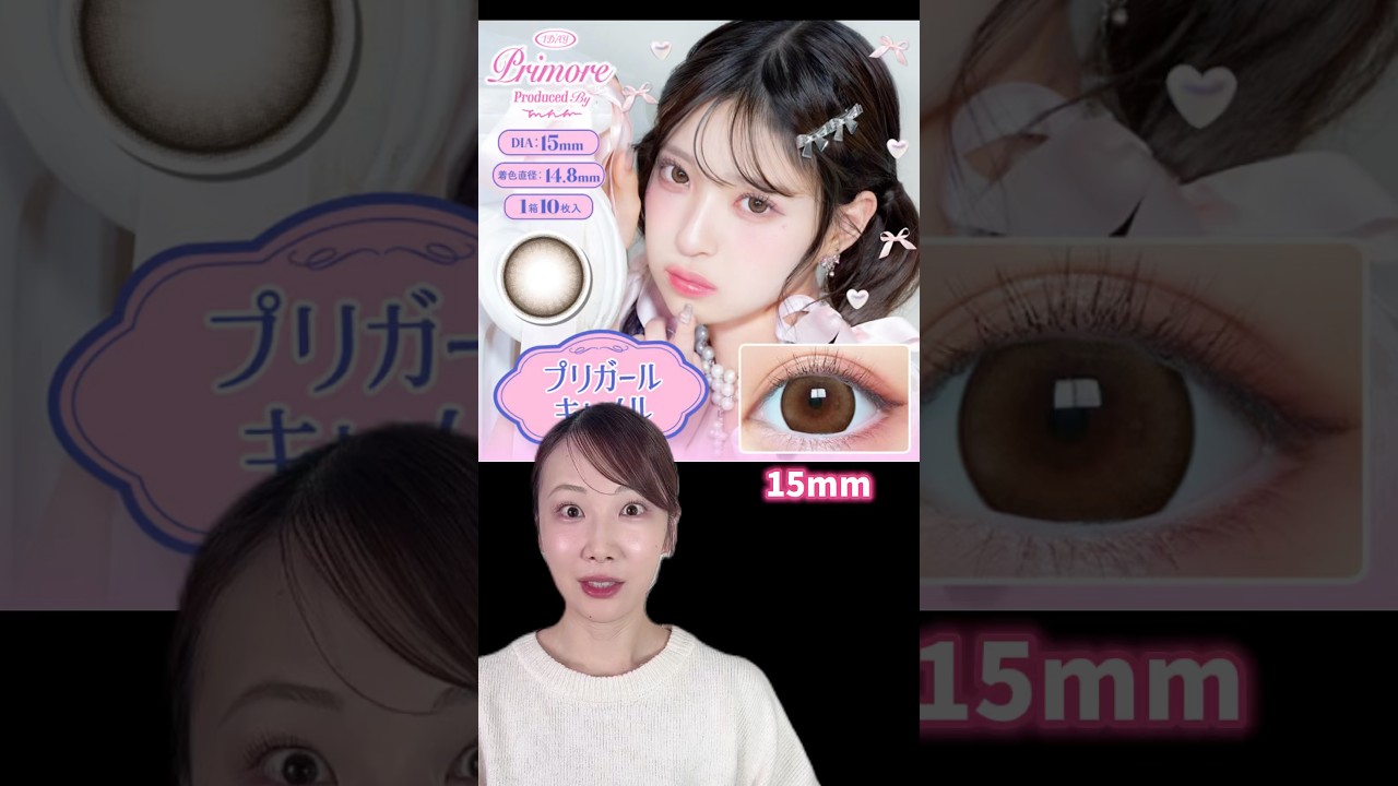 日本一でかいカラコンけます。 ギュルギュルリモはバレリーナみたいで 可愛いパパッケージでこれがレンズサイズ が15mmで着色直径が本最大の 14.8mmちなみにベースカーブは 8.7mmフリーガールキャメルを買い ました。おきぞ 。見て。なんかでかい。 ビルカに大きいぞ、これ。すご。入るのか目に。 確かに。まずね。 まずよ。普段何つけるんの? 普段ラ つける時。 つける時。[音楽] うん。 ま、大きくないやつ。 14.2とかくらい。 14とか 比べるとこんな感じ。それではけていきます。固めだけました。すんごいでかい。はい、両方けました。お、すごいじゃん。目を大きく見せるのが目的だから、濃いメイクとかの方が合いそうだよね。 近くで見ると色味はこんな感じ。 目を大きく見せたい方は是非次回世界初色鉛筆でメイクした女のマロはいかにチャンネル登録よろしくな。 Ja.